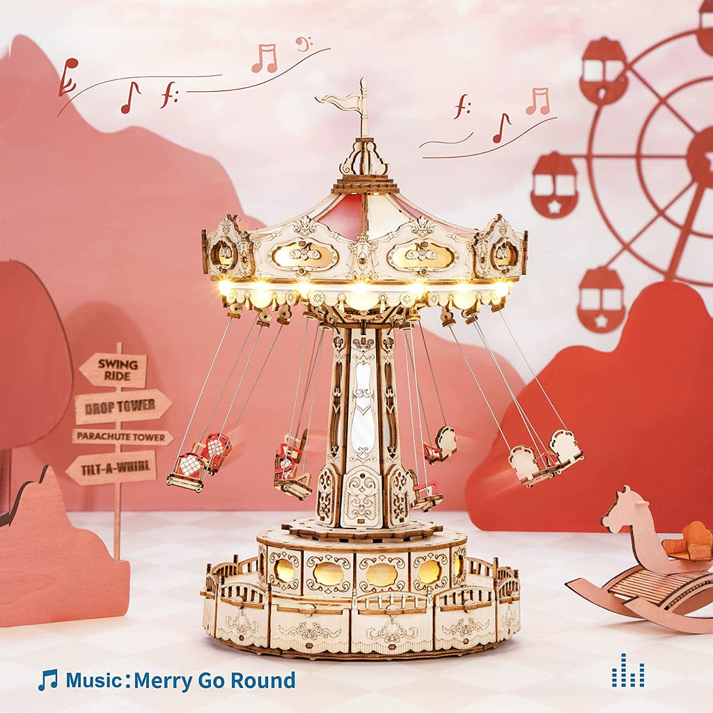 - [LED SWING RIDE KIT]This 3D wooden puzzle takes 6 hours to complete. When you press the switch, the lights will on and the music will play. Besides, the flying chairs and mirror tower will rotate automatically.